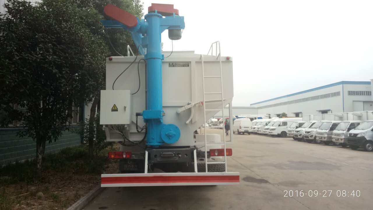 散裝飼料車工作原理:袋料,散裝飼料車在工作的時候首先打開箱體頂部中間兩倉的接料口,裝滿第一種飼料并保證每倉裝載3T然后打開最前及最后兩倉接料口,裝第二種飼料。這兩個倉位常閉倉,設有單獨倉口,因此也可分別裝載兩種飼料,這樣就實現整車裝運三種不同飼料的功能。