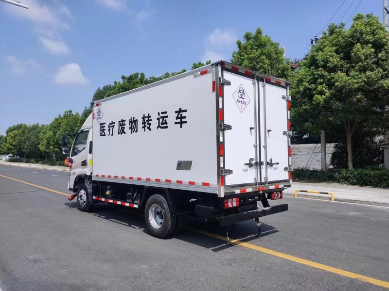 江淮駿鈴V5藍牌4米2醫療廢物轉運車專用配置:貨箱尺寸:4030*1870*1750(mm),廂體外蒙皮白色玻璃鋼,內蒙皮不銹鋼,中間8cm保溫板,地板為不銹鋼板,后雙開門,右側單側門,選裝后內掀門。廂內安裝紫外線消毒燈,噴霧消毒裝置,廂體外置廢液收集箱,安裝-5℃制冷機組。