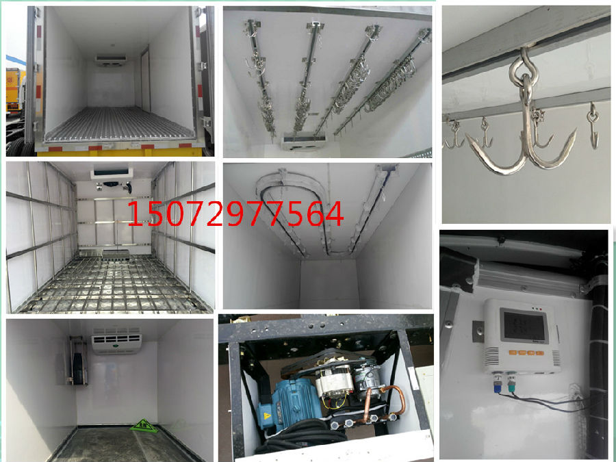 冷藏車箱體內部可根據客戶實際需求加裝通風槽,肉鉤導軌,側門,溫濕度記錄儀等,制冷機組有保鮮機組和制冷機組,水果蔬菜等保溫類選裝保鮮機組,肉類冷凍類選裝冷凍機組。