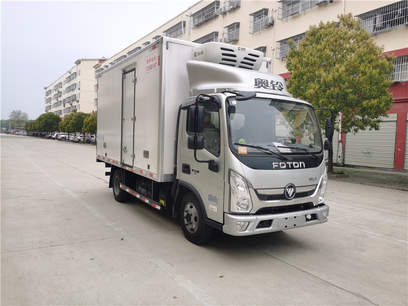 福田奧鈴速運藍牌4米2冷藏車上裝配置:箱體內尺寸4080x2100X2100(mm).龍骨連接鑲入環保防水木材起保溫耐腐蝕作用)、斷橋隔熱技術!保溫效果達到國家A級標準.箱板是由鍍鋅管骨架加上環保防水木板一次成型,中間8CM保溫板填充、加厚3.0玻璃鋼,高強度粘合劑、熱壓成型,外框采用304不銹鋼、加厚鋁型材包邊、27不銹鋼大門鎖、配件,箱體拼接出來不打膠無縫隙,降溫速度快、散溫慢、保溫效果好,門帶斜邊,副梁是710大梁鋼一次性折成,用壓板鎖緊,側護網和后保險杠一次性成型。壓板臺面生產前機器自動吸塵干凈,保證壓板機一次壓制成型,其生產設備及技術均領先同行業標準,箱體外形美觀,整體質量輕,強度高,無滲漏特點,箱體堅固耐用,保溫效果高.
